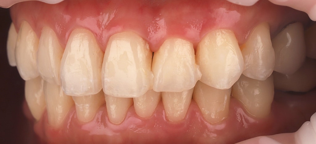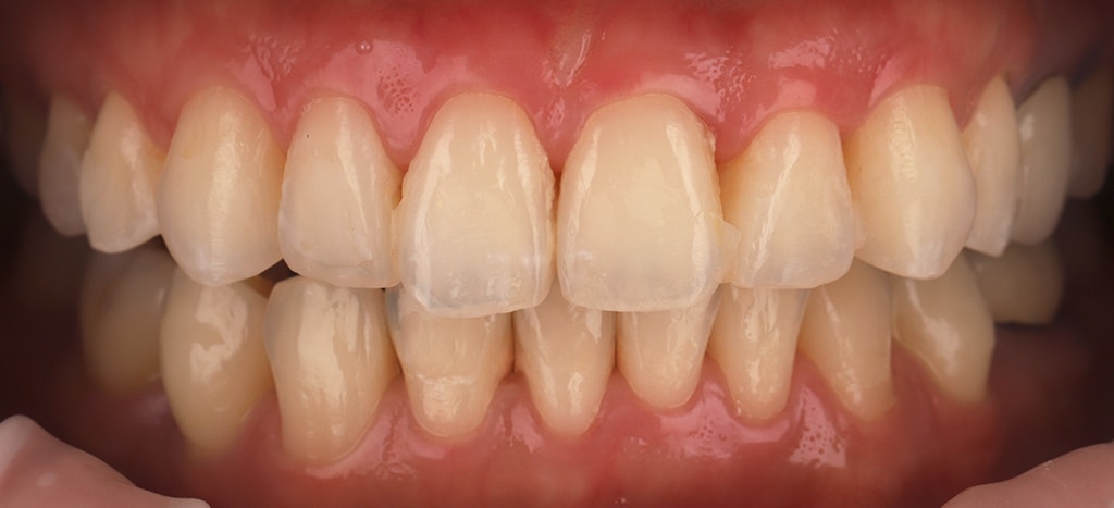 從左側與右側方向的照片皆可以看出,兩兩相鄰牙齒的牙縫,有不適當的樹脂填補物,這不僅會造成清潔上的困難,也會對笑容的美觀性產生極大的扣分。